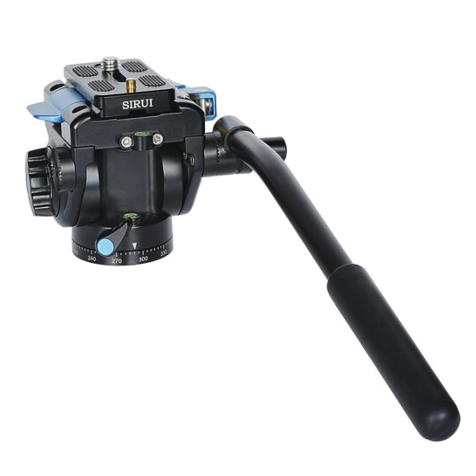 The VA-5X Fluid Video Head with Side-Loading Plate from Sirui uses a fluid system to produce smooth pans and tilts for DSLRs and compact video cameras weighing up to 6.6 lb. It features a side-loading quick release plate with a safety pin that is secured by a large, adjustable tension lever. The VA-5X has independent pan and tilt locks, a detachable pan handle that can be used on either side of the head, two bubble levels, and durable aluminum alloy construction.